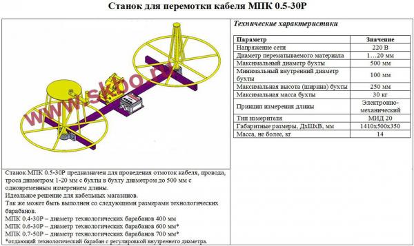 Станок для перемотки кабеля МПК 0,5-30Р состоит из рамы, двух технологических барабанов (приёмного и отдающего) и измерителя длины типа МИД 20 с электронным счётчиком. Погрешность измерения длины не превышает 1%, дискретность счёта 0,1 м.